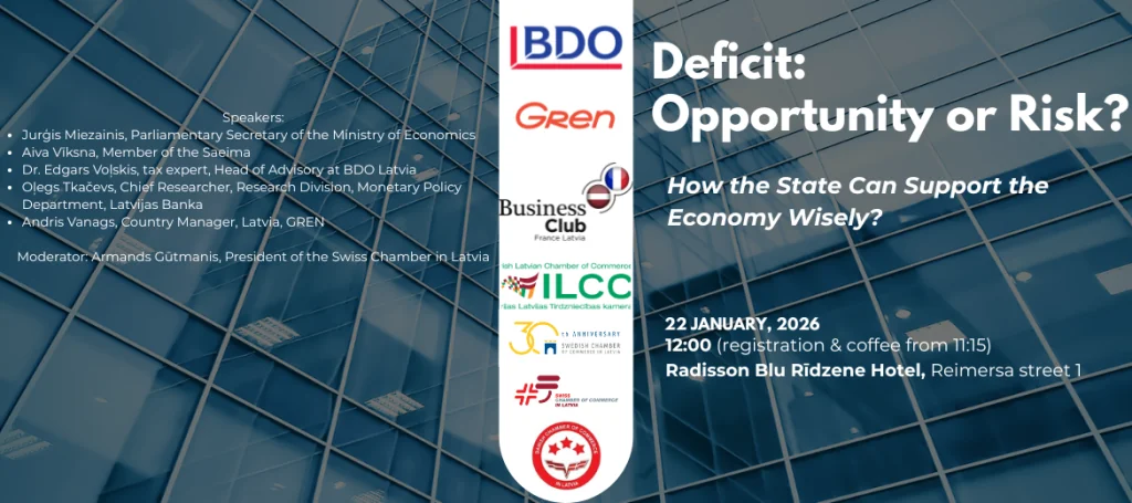 On 22 January 2026, from 12:00 to 14:00, the discussion “Deficit: Opportunity or Risk? How the State Can Support the Economy Wisely” will take place at the Radisson Blu Rīdzene Hotel, Kronvalda Hall.