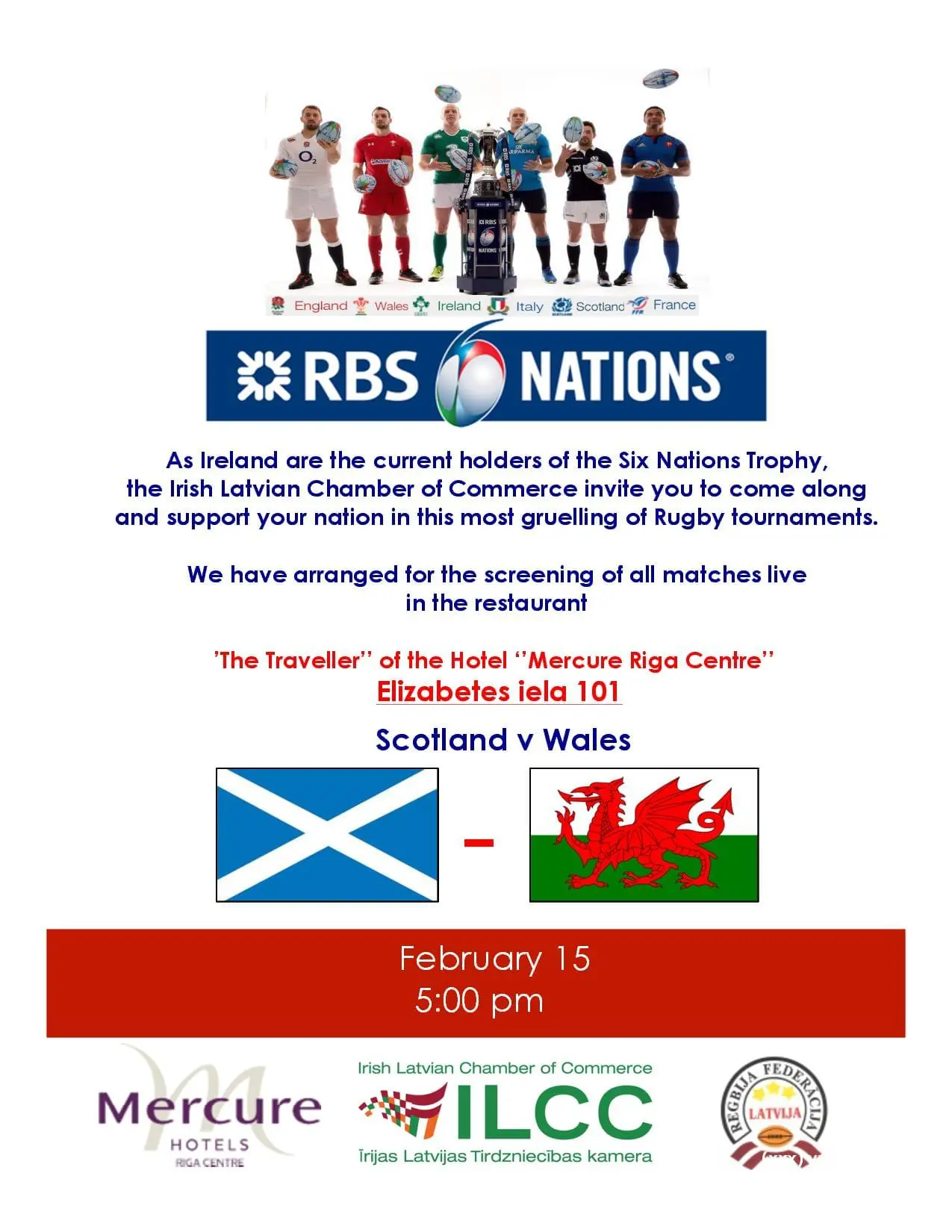 As Ireland are the current holders of the Six Nations Trophy, the Irish Latvian Chamber of Commerce invite you to come along and support your nation in this most gruelling of Rugby tournaments.
